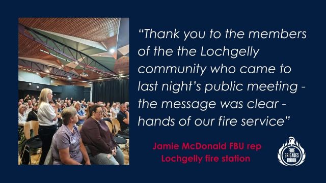 Lochgelly & the surrounding communities showed its strength and solidarity on Thursday 31st July as over 100 residents packed the public meeting at the Lochgelly Centre to oppose cuts to local fire services.